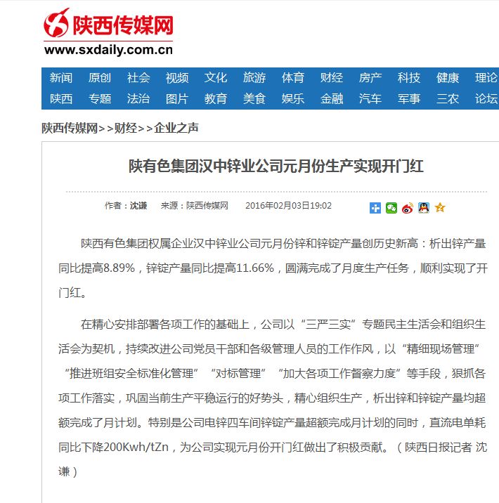 陜西傳媒網 陜西有色集團漢中鋅業公司元月份生產實現開門紅
